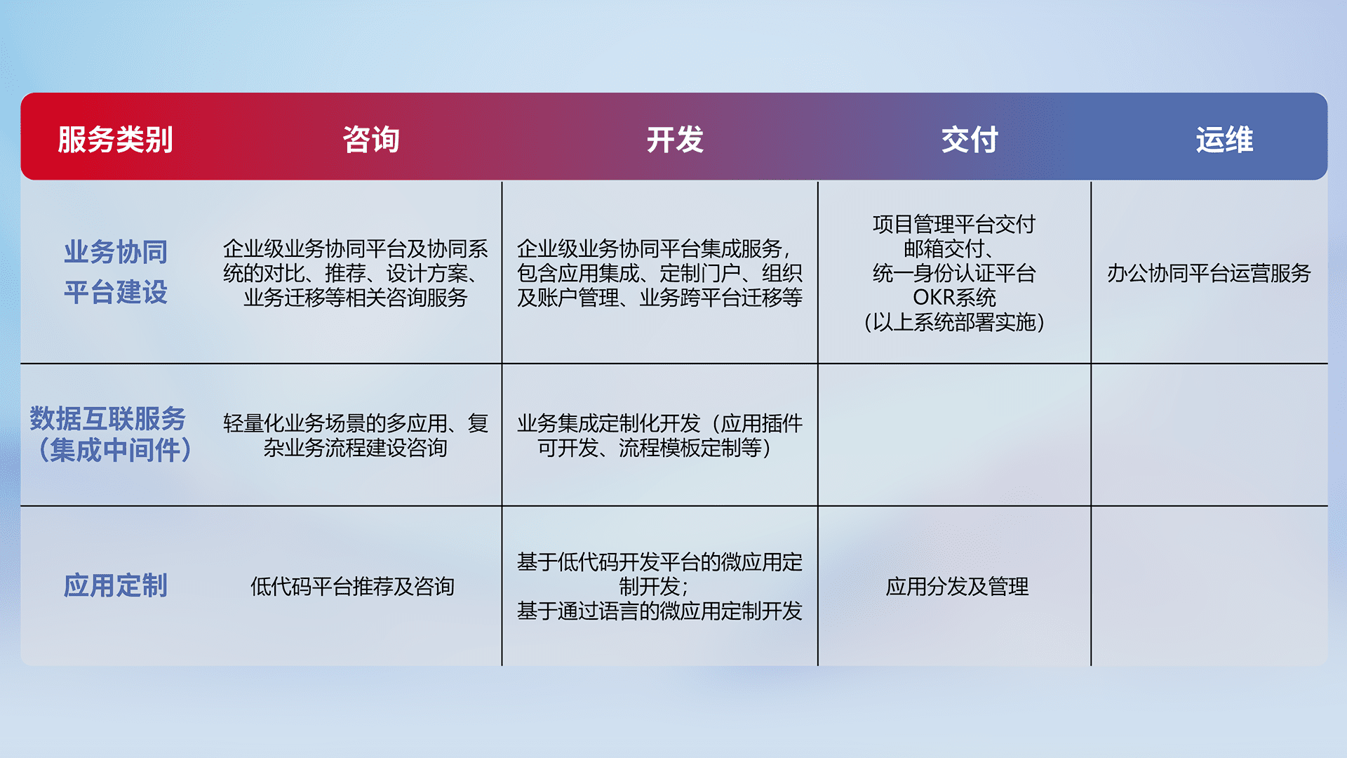 针对钉钉、、企微、、IDaas等平台级产品提供产品的规划、、、方案、、、、交付、、定制化开发等服务,,,,实现如统一协同办公、、智能客户服务、、、、混合会议管理、、、智能数据查询、、、等业务场景,,,,实现数字化转型。。。。